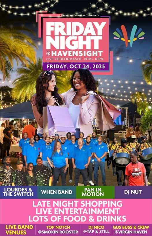 Join in the fun at Friday Night @ Havensight. There will be live performances by Lourdes & The Switch, the When Band and Pan in Motion with DJ Nut spinning tunes. Visit The Smoking Rooster to hear Topp Notch Band, The Tap & Still for DJ Nico and Virgin’s Haven for GusBus & Crew. Havensight’s shops will be open until 10 p.m., offering special discounts, while local vendors will serve up island delicacies.