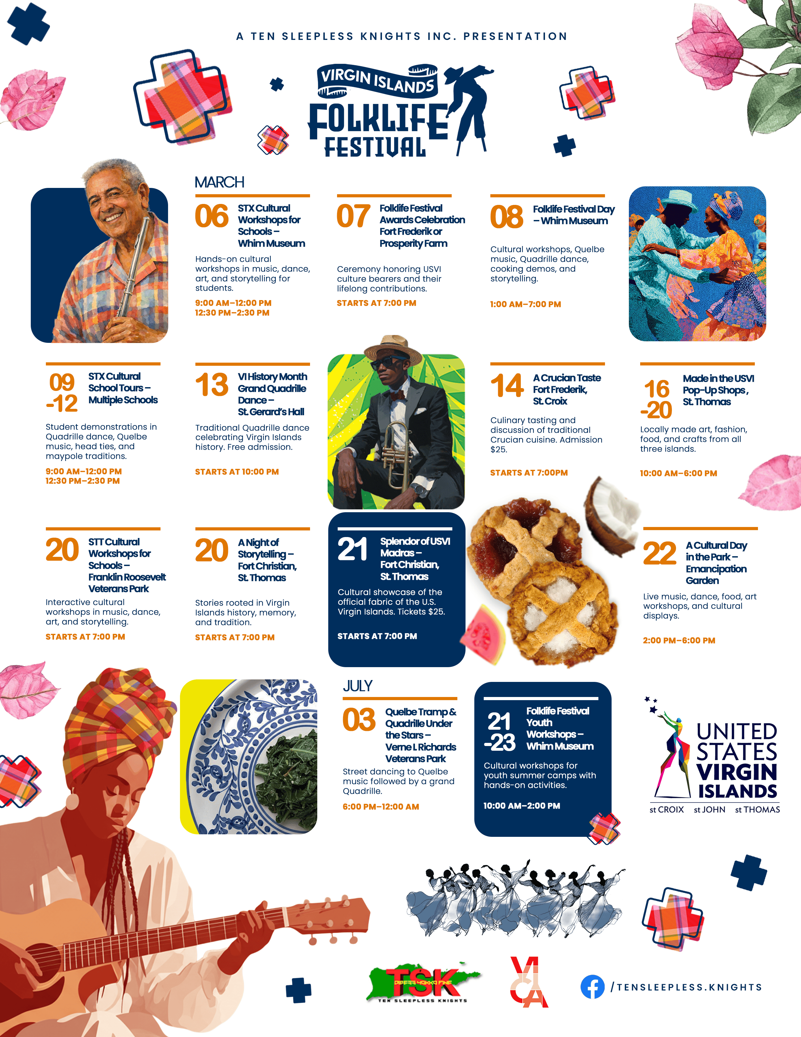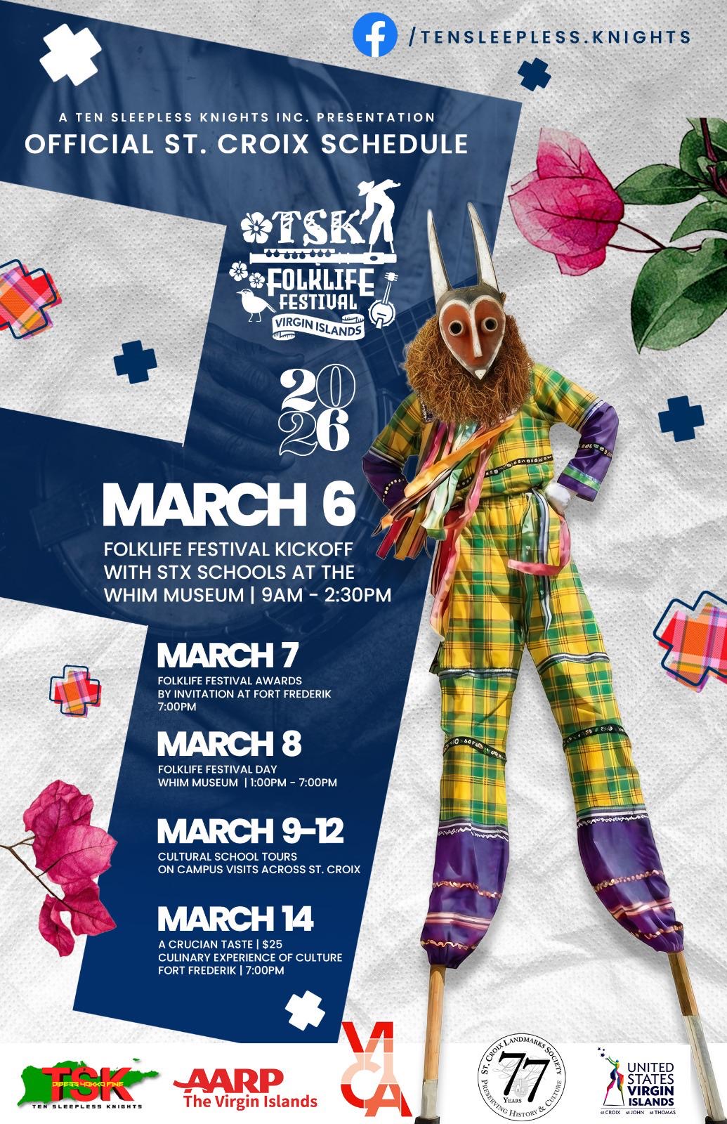 An array of cultural events and presentations are scheduled in March and July during the Virgin Islands Folklife Festival on St. Croix and St. Thomas. Events range from live music and quadrille dances to storytelling, cooking demonstrations, and shopping for locally made food, art and fashions. See the attached flyer for details about individual events.